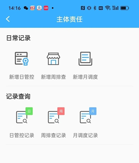 1、输入在“甘肃食品安全网”注册的帐号和密码(手机版由于收不到验证码无法注册)登录(不点选从业人员选项);进入首页,在“企业自律”栏目下,点击“主体责任”菜单;弹出主体责任页面,在“日常记录”栏目下,有“新增日管控”等按钮: