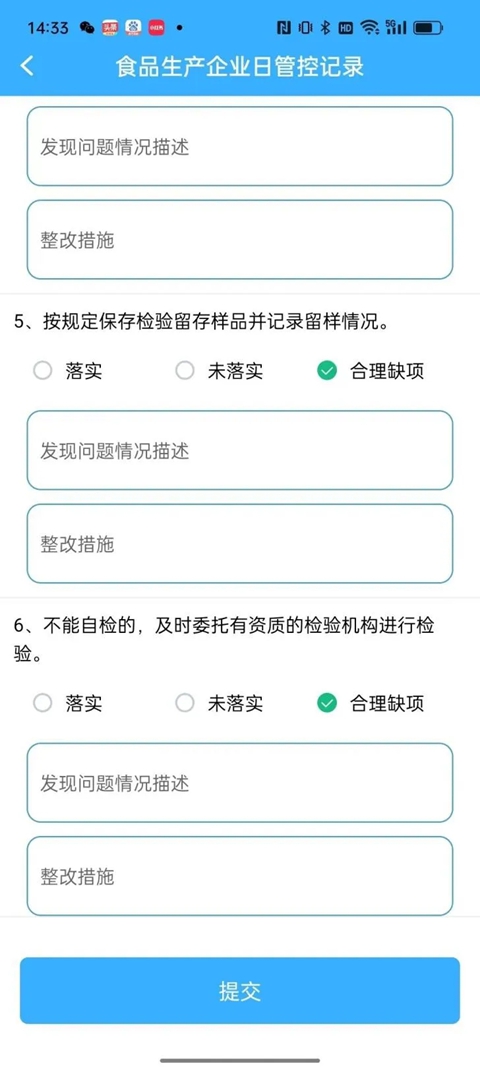 3、以检查表模式为例,点击检查表模式,进入日管控记录表:填写时,食品安全员:填写企业食品安全员姓名。检查场所:填写食品生产经营场所。检查时间为当日,对自查内容依次如实选择“落实”或“未落实”,与本企业无关的,点选“合理缺项”,完成后点击“提交”: