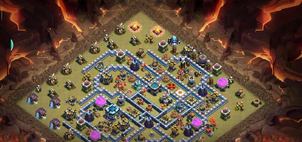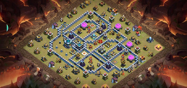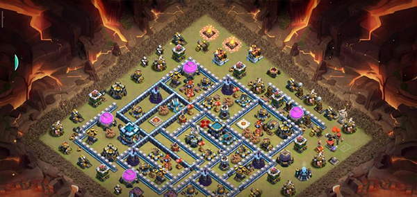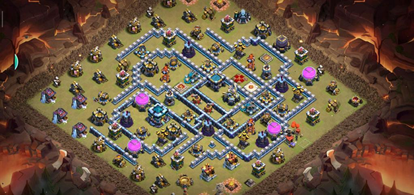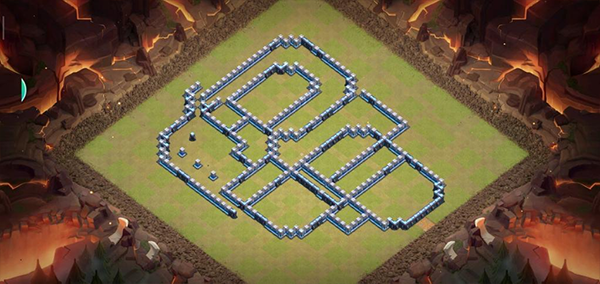 阵型解析:这是一个大本偏置的13本不规则格子阵,呈菱形的放置方法,大本与中心区域隔开放置。这种格局是一种比较常见的防守放置,对于陆军来说是需要弹跳或者地震才能穿透这个阵型的。火塔处均分散开,其中埋5电塔防止清边和引导部队走偏,也可以坑人。实测非常好用,适用于一般的部落战。