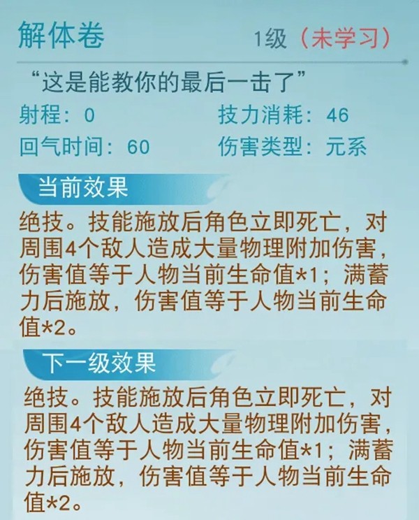 装备:在上图解体卷的技能介绍中,少侠们可以看到技能释放后产生的伤害是与人物当前生命值挂钩的,即血条越厚伤害越高。