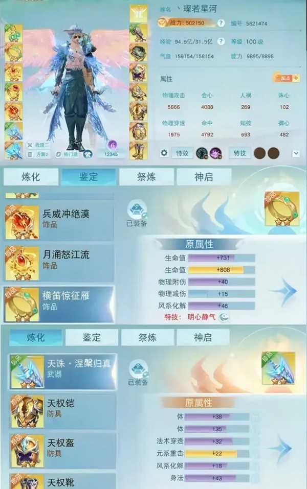 需要注意的是,以上养成建议中,在装备、鉴定、炼化上选择同步附伤的追求只适用于新区版本,成型后目标约为血量16W+、知彼御心2000+、附伤3500+ ,基本实现单挑能砍,团战能炸,极限回气在当前版本比较难,但不是没有,详情大家可见附图。