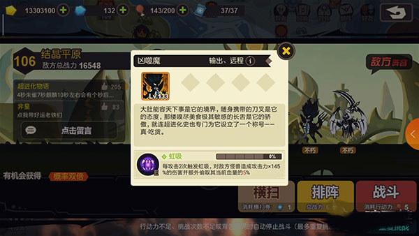 在第106关中,凶噬魔明显是敌方队伍的远程输出核心。凶噬魔不仅可以持续吸血,而且能对血量低于20%的怪物有斩杀效果,能造成巨量伤害。所以在和凶噬魔的战斗中,一定要防止队伍中残血的出现。
