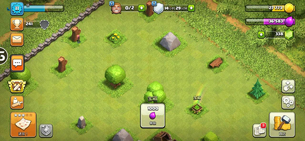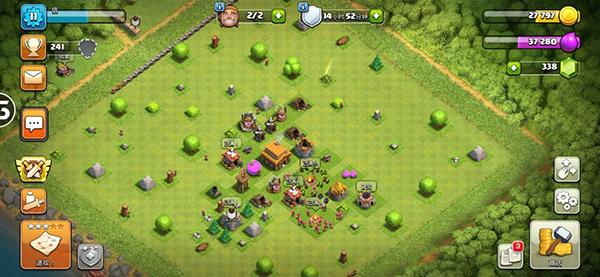 一个村庄的建造排布也是很重要的,这可以有效的保护好自己的资源和奖杯。低本的建筑物不多,平时没事的时候可以自己摆阵玩玩,利于熟悉自己的村庄。当然,最普遍的是大本营和资源内置,外围一层防御建筑,再包一层墙,收集器外置,等等。(下面是我自己的小村庄,啊哈哈哈,懒得摆阵就这样了)