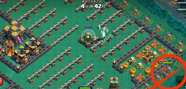 5、女王在拆炸弹塔的时候,就在下面的红色方框内下南瓜头野蛮人,10个左右就够,吸引x弩仇恨。这样可以进一步保证女王和女武神的状态良好。