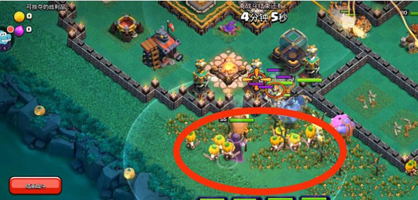 1、右侧红圈内下女武神×2,女武神会自动破墙,破墙后会去打圣水罐。