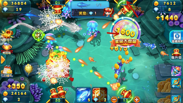 3、彩金鱼击杀可累计摇奖,多种福利,高倍率出金币,享受街机捕鱼乐趣。