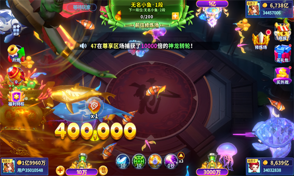 3、捕获各类鱼群:通过精准射击,捕获屏幕上的各类鱼群。