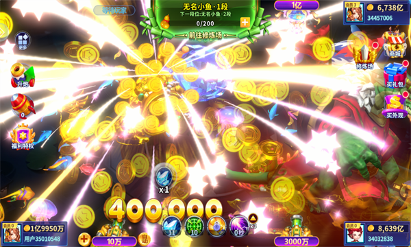 1、实时联网竞技,丰富奖励,小鱼钻石爆率高,大鱼和BOSS更易击杀,升级炮台至10000倍炮;
