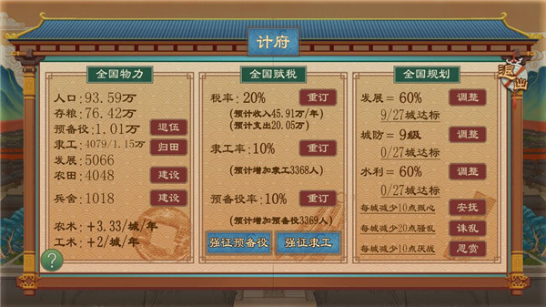 全国发展规划影响着后续每年的财政收入和支出,在“游戏界面右侧切换都城视图-计府”中找到 【百工署】 便可对发展规划进行调整,一般开局建议将发展定为30%,城防、水利定为3级,比较有利于国家前期的平稳发展。