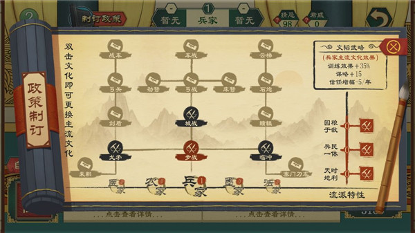 游戏内共有九种流派,流派是国家发展的基础方针,不同流派关系着国家的发展方向和各项能力的强弱,新手开局推荐使用【农家】或者【兵家】