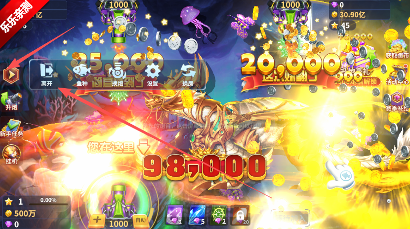 4、来到捕鱼游戏竞技对战房间以后,无需停留,直接点击左上方的三角图标“离开”房间,返回大厅。