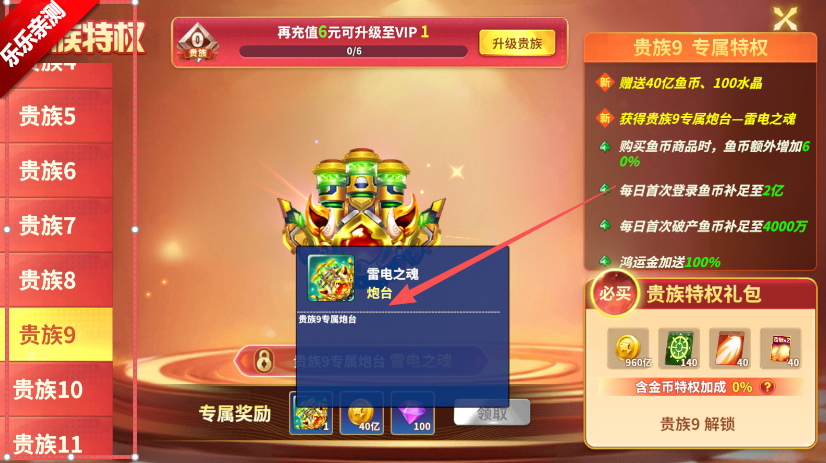 游戏内设有9个贵族等级,每提升一级均可解锁对应的专属炮台。这些贵族专属炮台不仅造型独特,更能显著增强捕鱼火力,让玩家在游戏中获得更出色的战斗体验。随着贵族等级提升,解锁的炮台性能也将随之增强,为玩家带来持续成长的游戏乐趣。