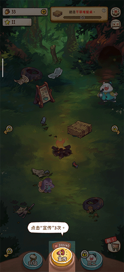细节操作:通过升级设施(如餐桌、餐车、菜单)提升服务效率,根据顾客需求制作美食以获取金币(松子),用于解锁新设施和菜谱。