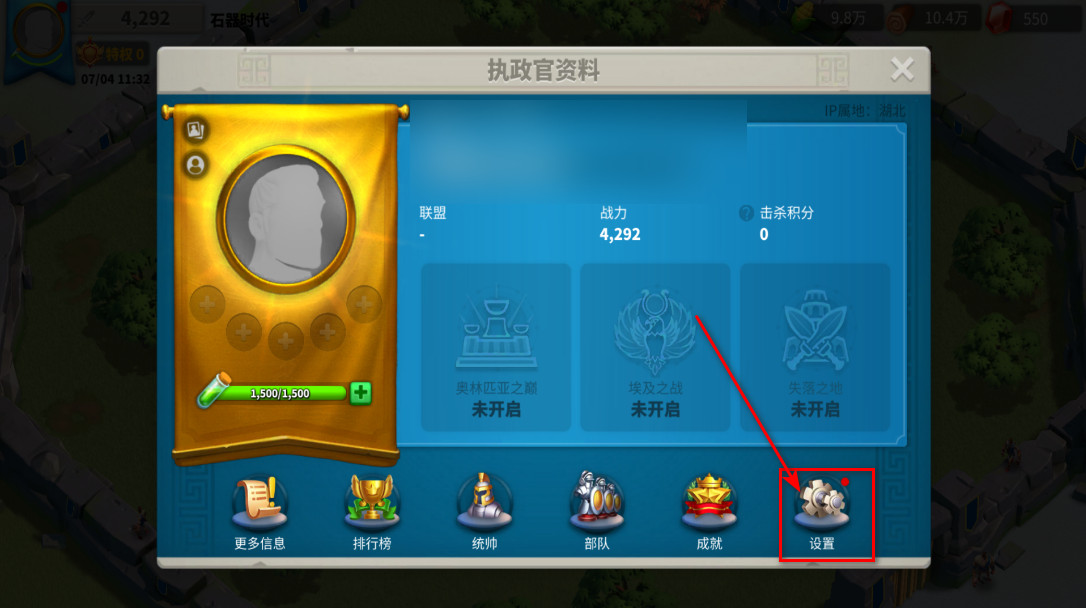 ①城墙Lv.10 15h33m 粮92.0K、木106.0K、石164.0K
