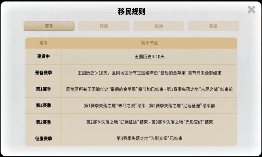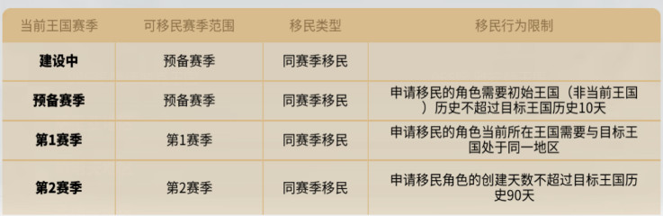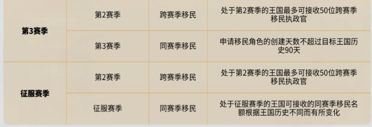 当前王国与目标王国赛季不同,且当前王国开放时间早于目标王国,执政官可以进行跨赛季移民(使用新手移民传送至“建设中”的王国不属于跨赛季移民)。