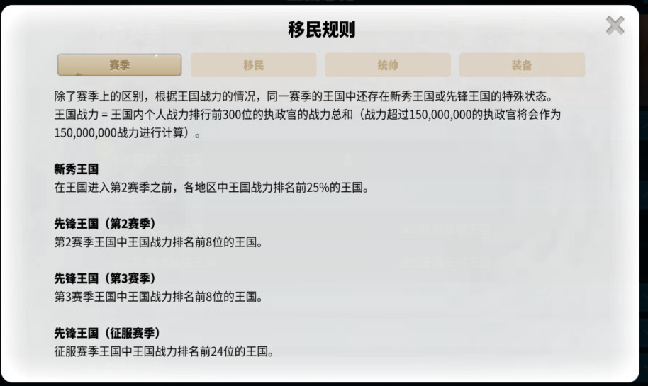 战力低于10,000,000的执政官将无法获取跨赛季移民名额。