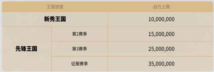 新秀王国及先锋王国的战力限制为固定值,具体设定规则如下:
