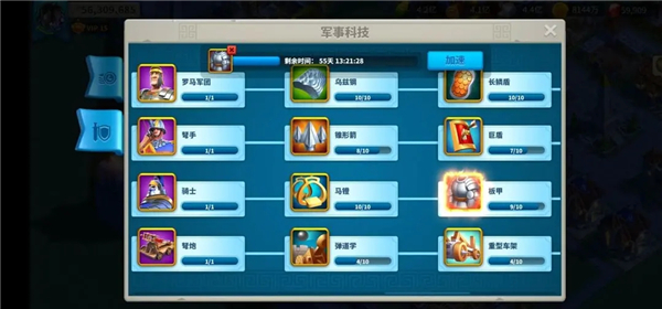 中期科技:这里的科技就是T4兵种研究的前置科技,当然他们不用需要全部研究满就可以研究T4了。但是因为中间三项科技都是十等级,所以需要很长时间,这三项的等级十部分每项拿到符文按满帮助都需要一百天左右,我们称之为小三元,等级十部分的研究一般等到中后期进行。