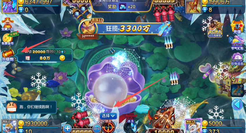 4、道具使用:点击屏幕右侧道具栏,可使用“冰冻弹”冻结鱼群、“雷电术”全屏秒杀普通鱼。