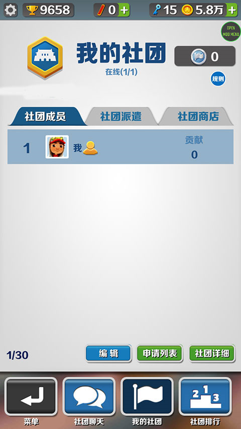 1、首先打开地铁跑酷雾绕2.0定制专属版本,点击主界面右下角的【社团】入口。