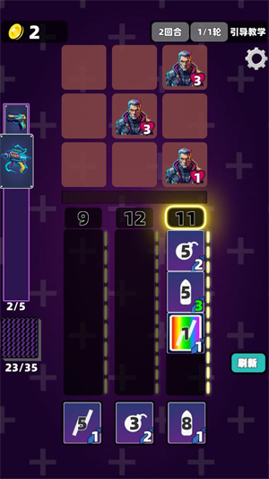 4、进入战斗后玩家需要将数字卡片放入对应的卡槽里,当卡牌数字之和是卡槽的数字就可以攻击当前一列的敌人。