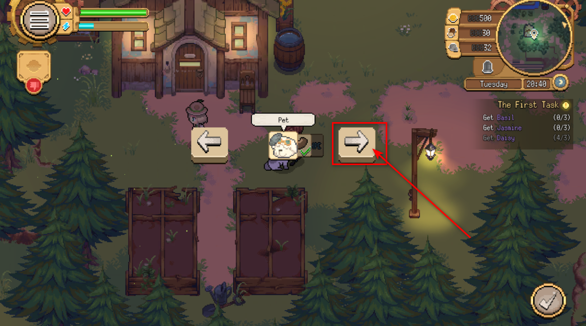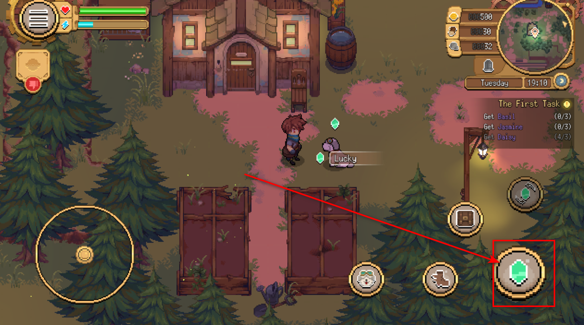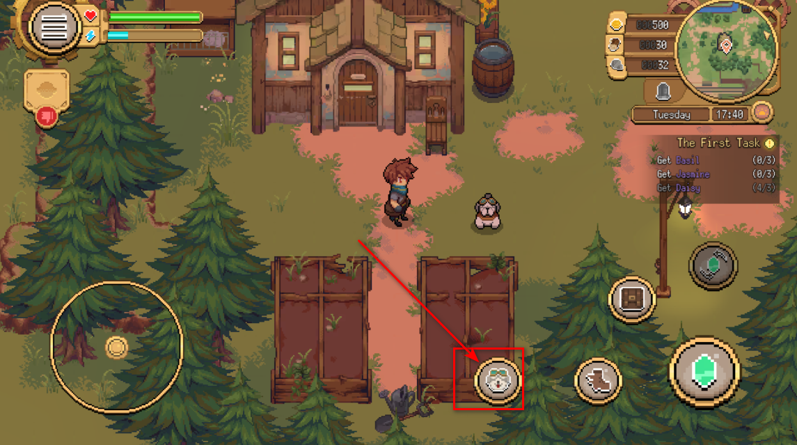 2.然后我们靠近狗狗,直到下方方框里的图标出现,然后点击图标。