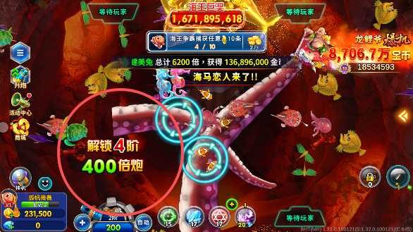 全新闯关玩法,勇闯鲨鱼阵,KO海怪BOSS,过五关抓六将,尽享捕鱼之乐!
