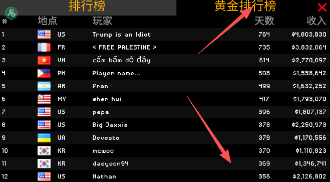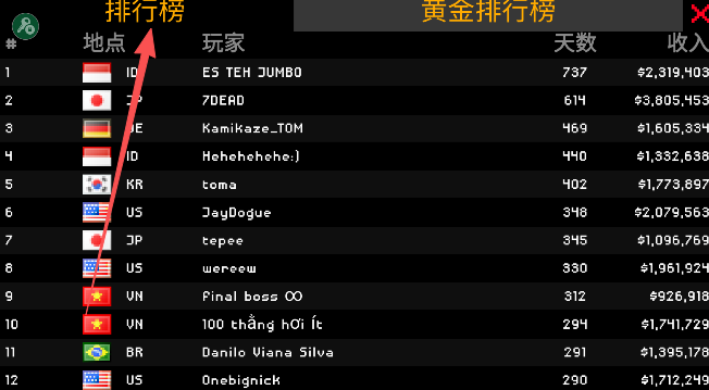 2、普通排行榜,可以清楚地看到当前全球各地游戏玩家们的游戏天数和收入详细。