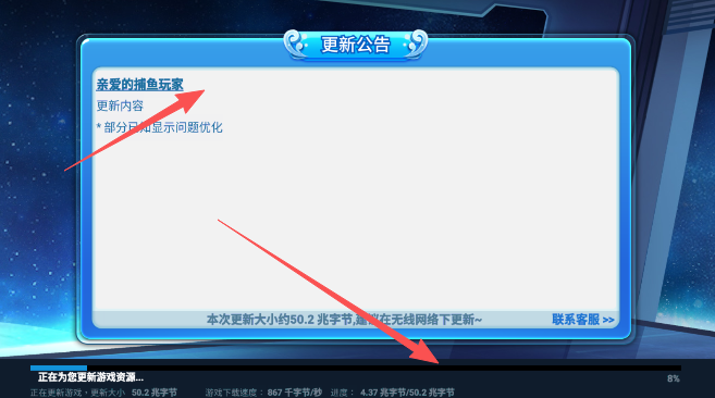 1、下载本网站捕鱼骑兵游戏客户端,查看游戏最新公告,等待游戏配置等资源下载完成启动。