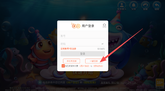 2、在用户登录界面输入账号密码点击一键注册。