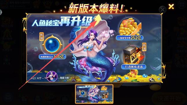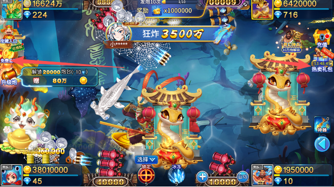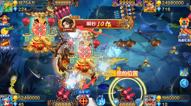 4、选择并升级的你的游戏炮台,将它的瞄准方向对准稀有鱼类,与游戏房间内的其他玩家们嗯,共同角色竞技出最后的游戏胜利者方。