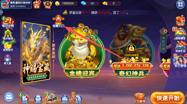1、先从获得免费金币说起,当你登录进入游戏大厅,会看到一个财神爷,没错,真的是财神爷。