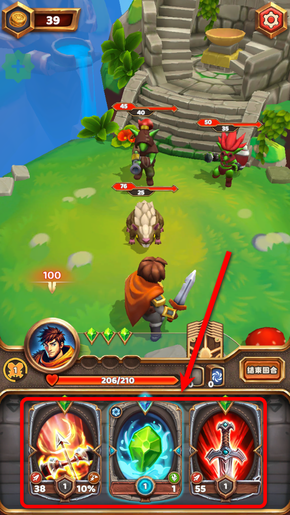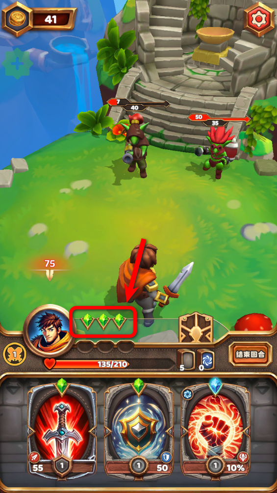 4、这个绿色的石头就是你的回合数,一块石头代表一次攻击机会,卡牌上有绿石头标志的就是需要耗费绿色石头的。
