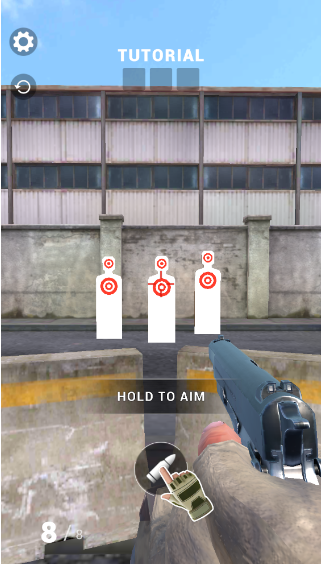 2、按住屏幕中间的子弹图标,然后滑动屏幕移动准心,对准目标后松开手指即可开枪