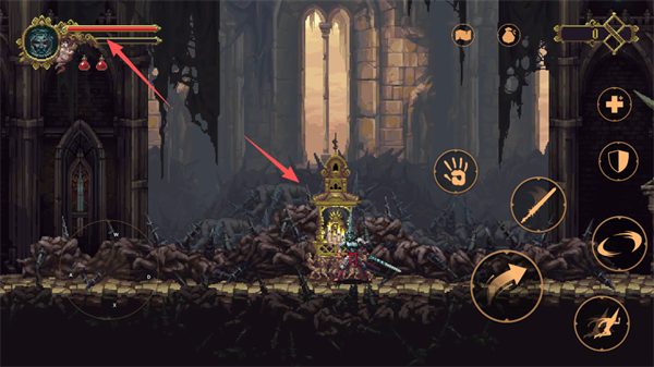 4、上方显示的是角色的血条,当血量耗尽时,可以在神像前回血,或者点击右侧的【+号】使用药水进行恢复。