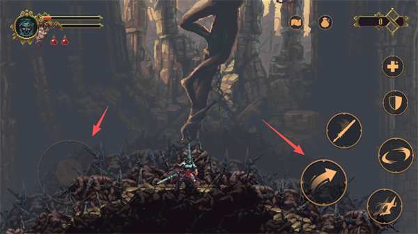 矮小荆棘处:使用“遗村歌”技能下砸,可打开向下通路,获取特殊道具(如“水银”提升血瓶回复量)。
