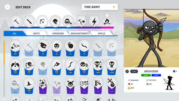 4、利用个性化的皮肤工具提高火柴人的能力,分配金币,合理的分配火柴人,将会更好的取得胜利!