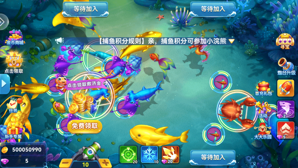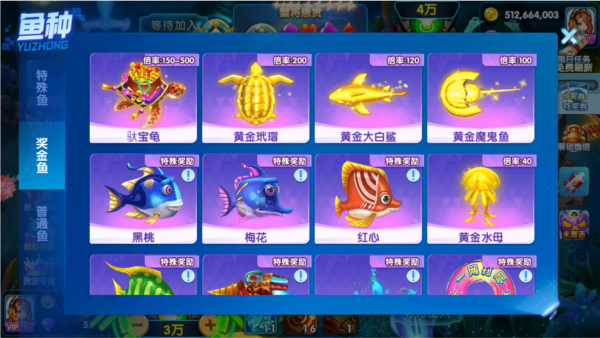 奖金鱼:奖金鱼种有50-120倍各种不同倍率,更有金蟾、金龟等华丽鱼种,捕获奖金鱼可获得额外奖金奖励。