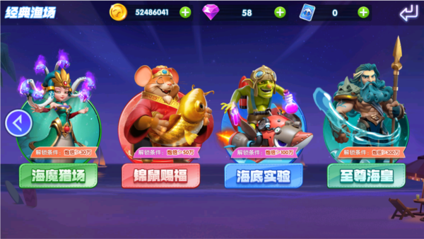炮台升级:玩家可以通过消耗钻石对炮台进行升级,最高炮率为10000倍。随着炮台升级,玩家消耗和获得金币数量也随着提升。