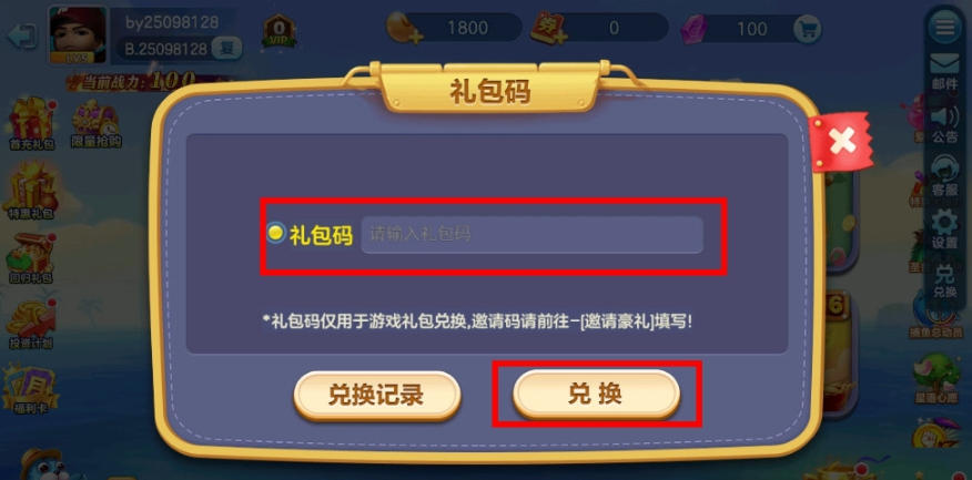 3、在出现的弹窗中输入兑换码,然后点击兑换即可兑换