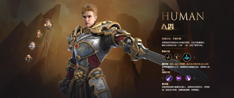 玩家在创建角色时,会有4个种族供玩家选择,每一个种族都会有男、女两个形态选择。种族的选择只是在形态上有所差异,其中,人类动作帅气潇洒;精灵族穿梭林间,步履轻盈,长耳异瞳,长相俊美;兽人孔武有力,尽显野性之美;矮人族看似跳脱,男子像神秘的先知,女生像是可爱的小萝莉。