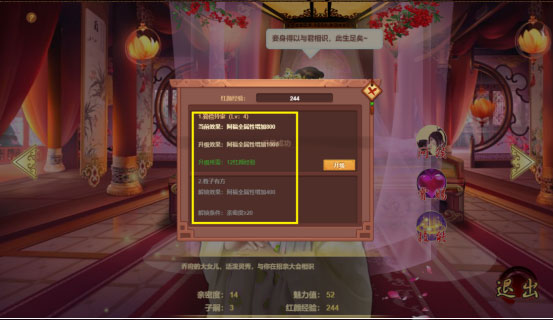 玩家在游戏的过程中,可以将红颜美女娶回家。红颜可以增加对应门客的属性值,还可以通过随机传召或者宠幸增加子嗣,是游戏中重要的辅助。