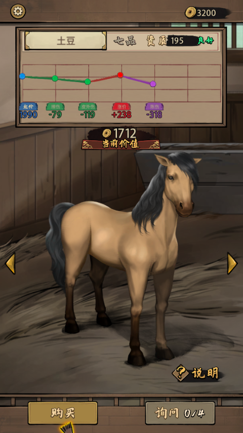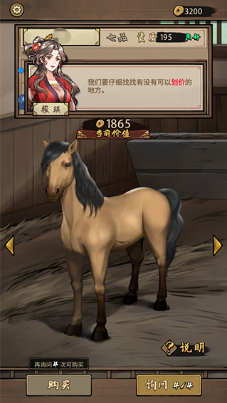 2、在购买跑马之前要先点击右边的箭头调马身上的污点询问降价,比如点击这匹马的屁股上的印记,再选择右下角的询问,即可降到相应的价格,这里你一共有4次降价询问的机会,好好把握,争取最低价拿下这匹宝马。