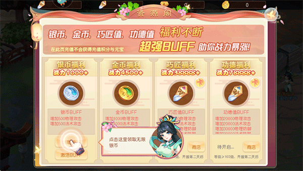 4、在游戏主菜单中点击资源阁,再点击这里立即领取无限银币;