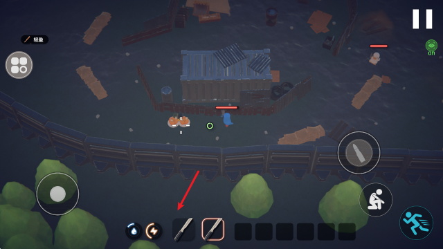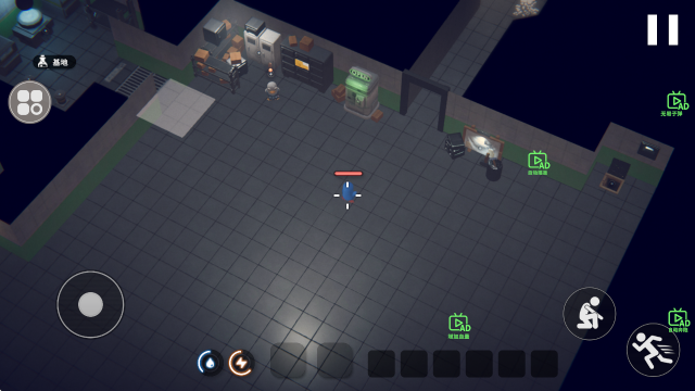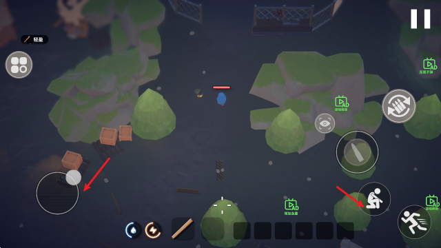 1、进入游戏后,左侧的摇杆控制移动,右侧还能够蹲下和加速。