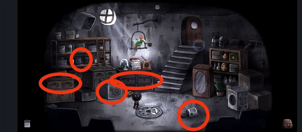 6、先翻垃圾桶获得玩具铁轨,右走至楼梯下面的地下室入口处(密码在墙上的海报里)点眼月,从楼梯上二楼拼好铁轨开启玩具车,右边的门就开了