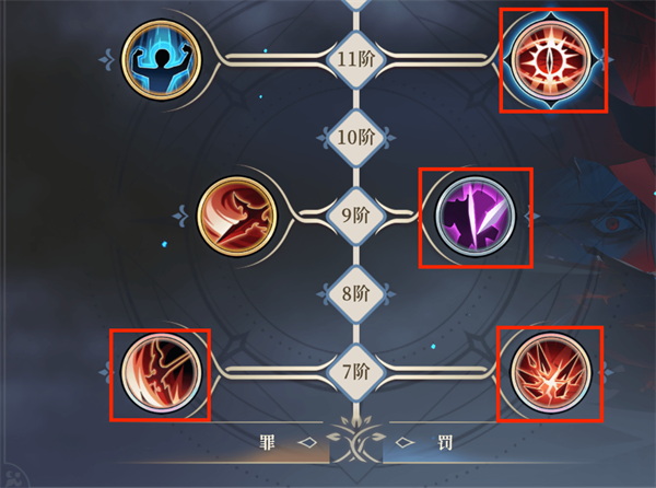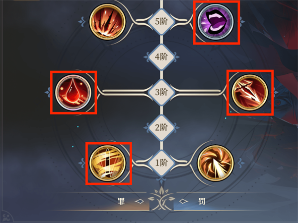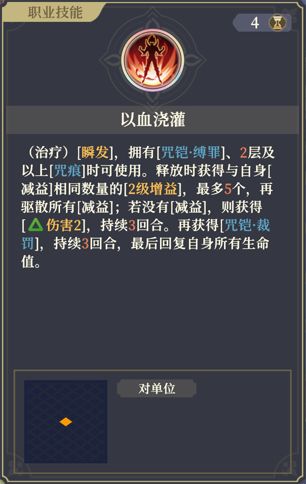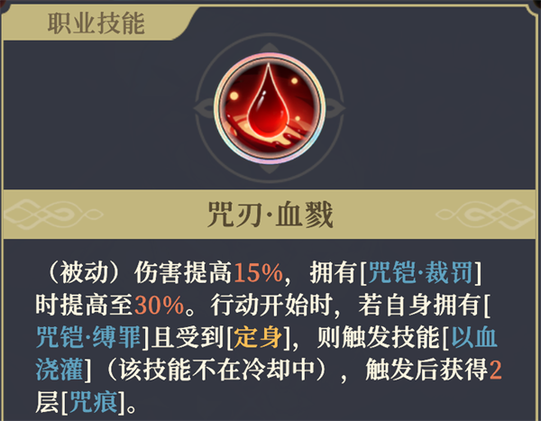 攻防属性提高5% / 10% / 10% / 15% / 15%。战斗开始时获得[咒铠·缚罪],及2 / 2 / 2 / 4 / 6层[咒痕],最多4 / 4 / 4 / 6 / 6层;拥有额外技能[以血浇灌],释放后使[咒铠·缚罪]转为[咒铠·裁罚],持续3回合,结束时移除所有[咒痕]。