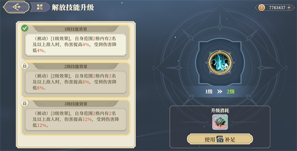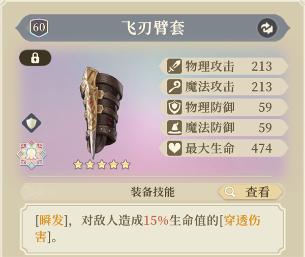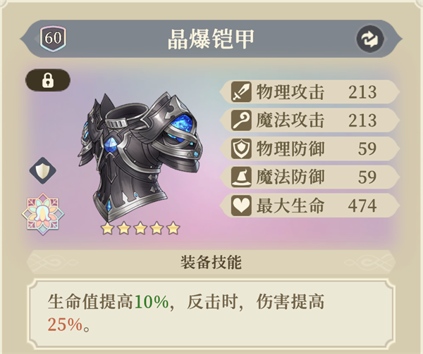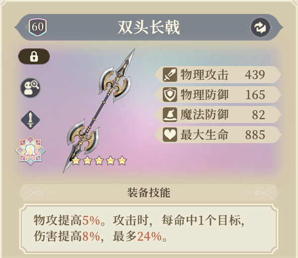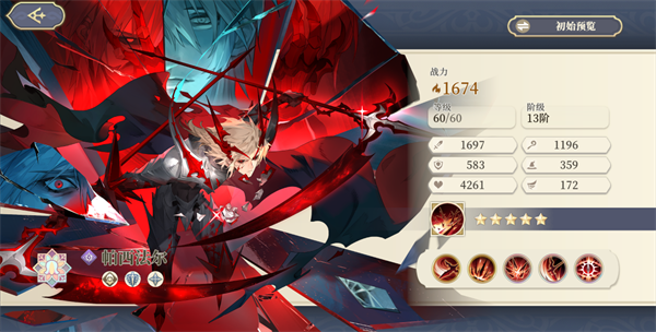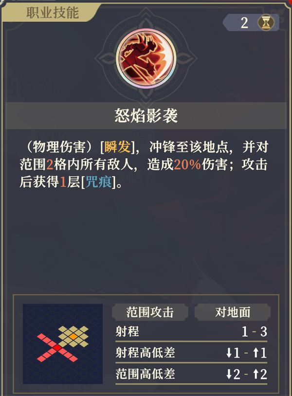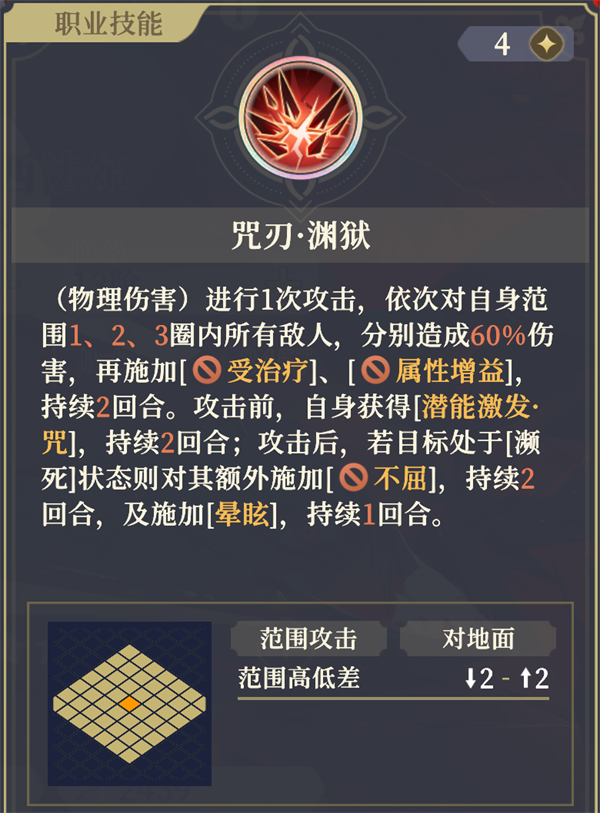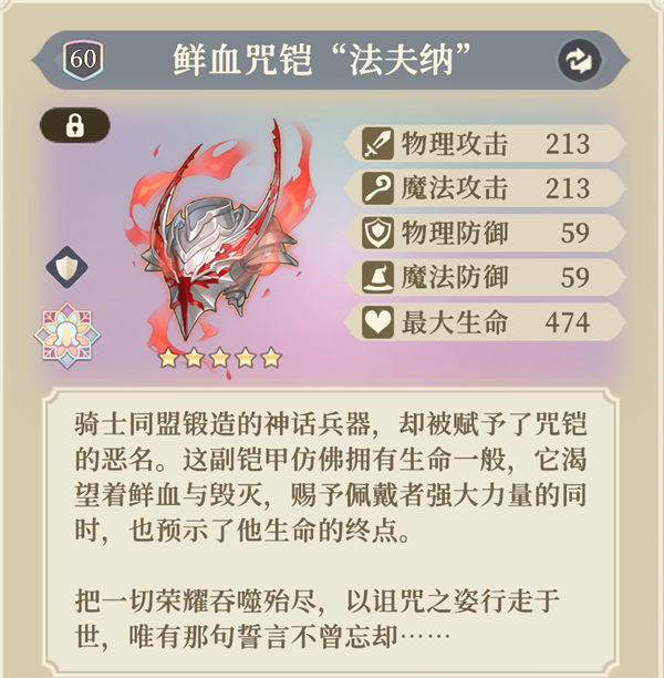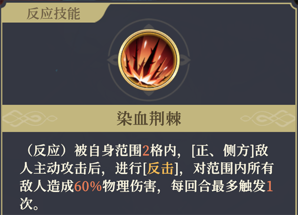 各星级效果:初始移动力小于等于3时,自身移动力增加1格;攻防属性提高3% / 3% / 6% / 6%/ 9%。战斗回合开始时获得3层[鲜血咒铠],每层攻防属性降低4% / 3% / 3% / 2% / 2%,最多3层,持续2回合。
