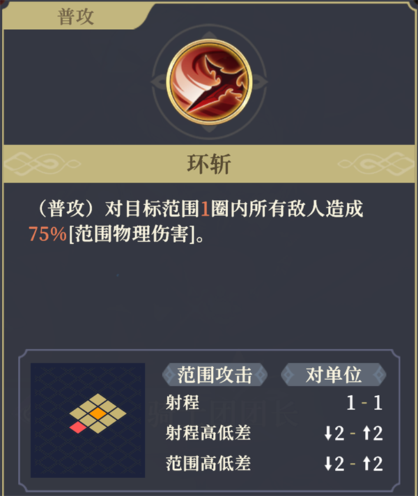 与其他角色的范围型普攻相比,环斩的倍率略高(黎各和歌洛莉亚的倍率都是70%),但比起“破甲击”而言倍率还是太低。