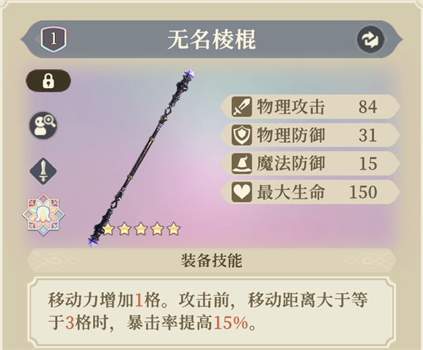 装备无名棱棍时,[咒铠·裁罚]状态下帕西法尔的移动力为:初始3+专武1+裁罚1+棱棍1=6。